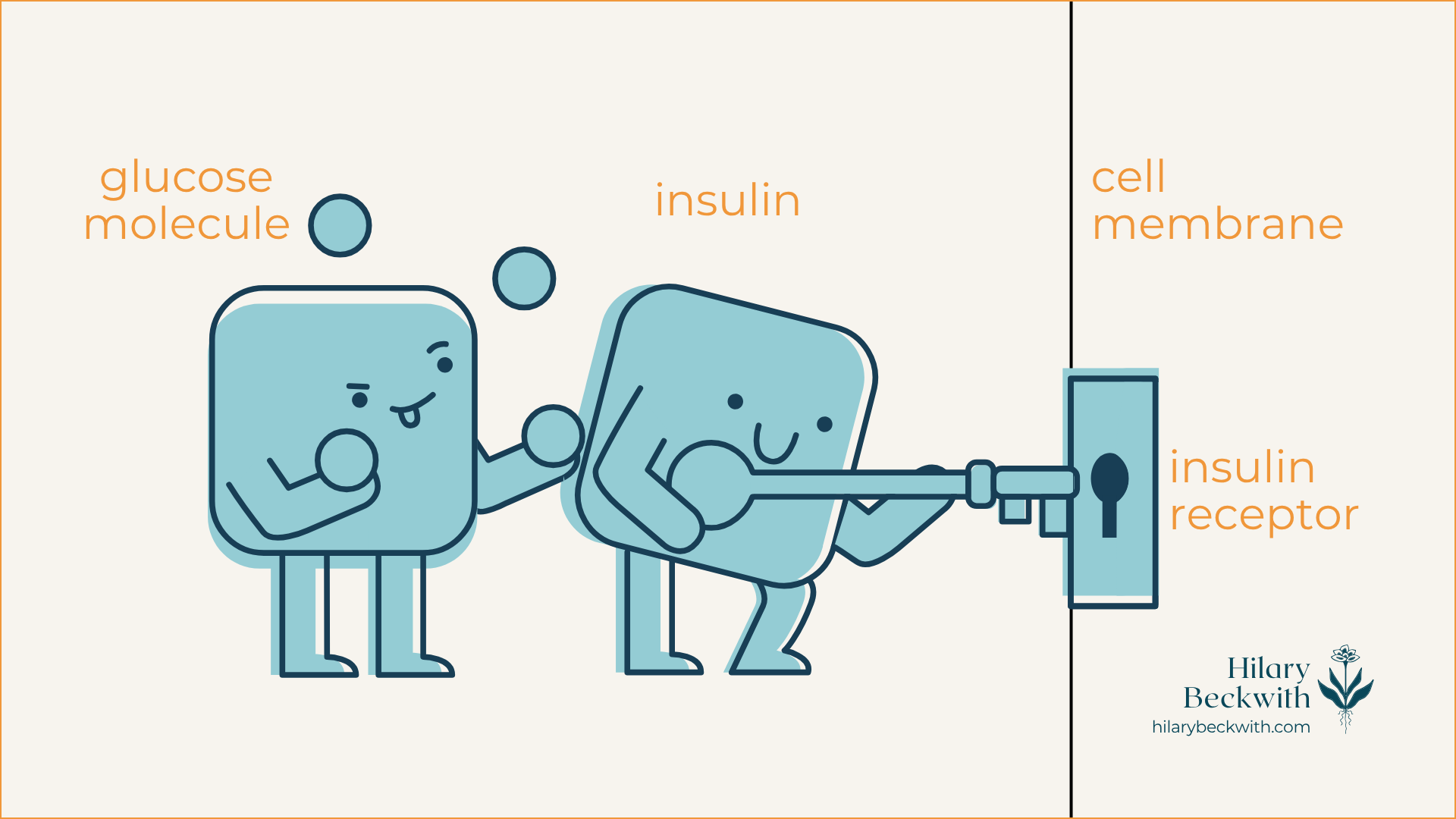 Insulin is released by the pancreas and acts as sort of an usher, taking the glucose to individual cells, and using its key to unlock the door (insulin receptors embedded in the cell membrane) and shuttles the glucose in to be metabolized (hey, there’s that word again!) via the Krebs cycle within the mitochondria.